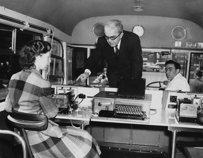 Politisi Inggris, Charles Hill (1904 - 1989), berbicara kepada operator telegraf di Kantor Pos Pusat King Edward, London, (26/4/1956). (Photo by Fred Ramage/Keystone/Hulton Archive/Getty Images)