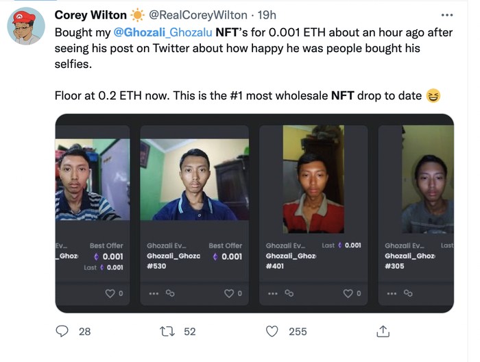 Para kolektor NFT berbondong-bondong membeli selfie Ghozali dan tak peduli pada item lain. Foto: Twitter