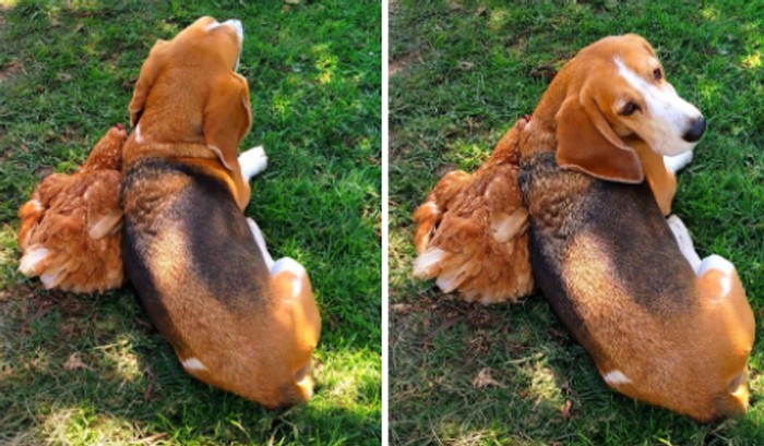 Tampak si ayam dan anjing sednag santai. Foto: Brightside