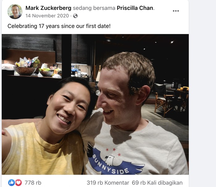 Dalam postingan Facebook di November 2020, Mark Zuckerberg menulis caption bahwa dia dan istrinya Priscilla Chan merayakan 17 tahun kebersamaan mereka. Berarti pada saat ini setelah 2 tahun berlalu, mereka bersama sekitar 19 tahun lamanya. Foto: Facebook