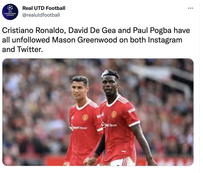Para pemain MU pun ramai-ramai unfollow akun Greenwood di Instagram. Dari Cristiano Ronaldo, Paul Pogba sampai David De Gea. Foto: Twitter