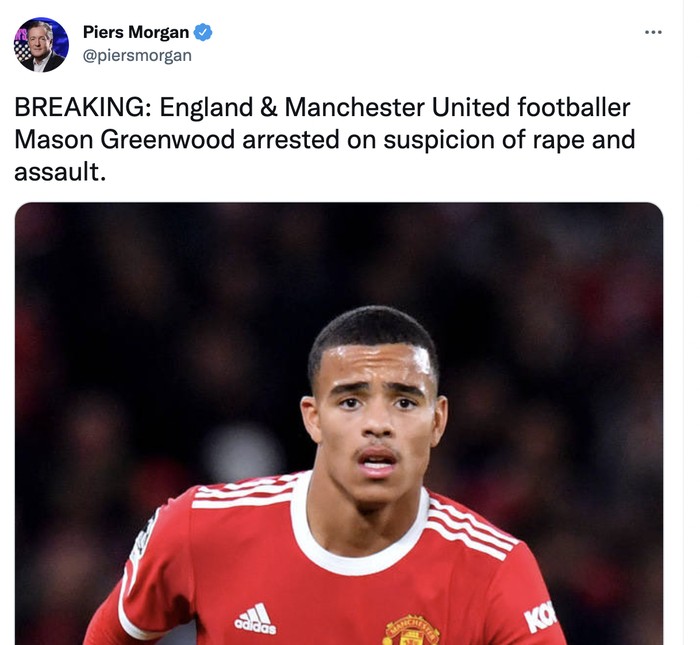 Presenter kenamaan Inggris, Piers Morgan, turut mengabarkan bahwa Greenwood ditangkap atas dugaan pemerkosaan dan penganiayaan. Foto: Twitter