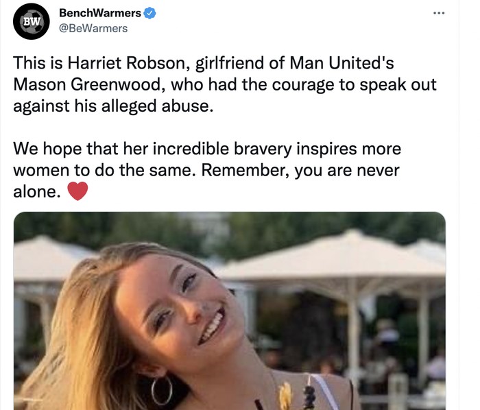 Netizen pun mendukung Harriet Robson yang mengaku dianiaya Greenwood. "Kita berharap keberaniannnya yang luar biasa akan menginspirasi lebih banyak wanita melakukan hal yang sama, kalian tak pernah sendiri," tulis netizen ini. Foto: Twitter
