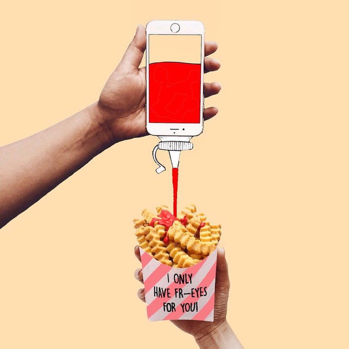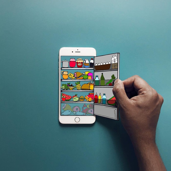Caranya menabrakkan gambar-gambarnya pada ponselnya menciptakan ilusi visual mulus dan lincah, memudarkan batasan antara dunia materil dan digital. Banyak postingannya terkait makanan. Foto: Instagram/Anshuman Ghosh
