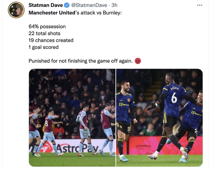 Dalam laga semalam, MU unggul segalanya dari Burnley, tapi lupa mencetak lebih banyak gol. Foto: Twitter