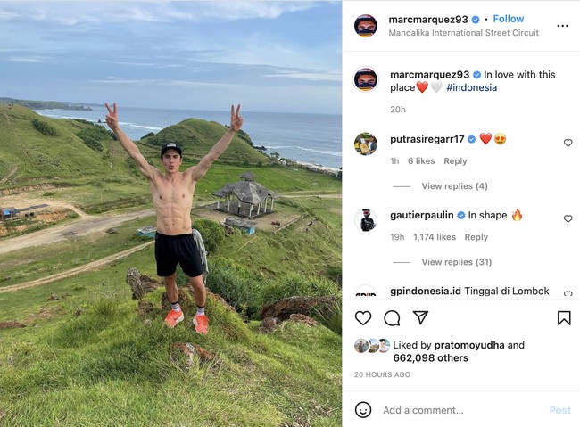 Pose Marc Marquez di atas bukit dekat Sirkuit Mandalika yang mengundang netizen untuk bersenda gurau dengan The Baby Alien. Foto: Twitter