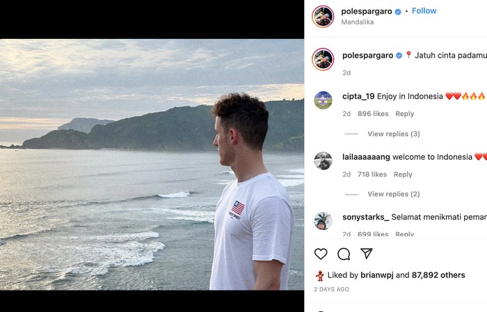 11. Pol Espargaro: Pol Espargaro terpukau menatap keindahan lautan Lombok meraih 87 ribu Like. Foto: Instagram