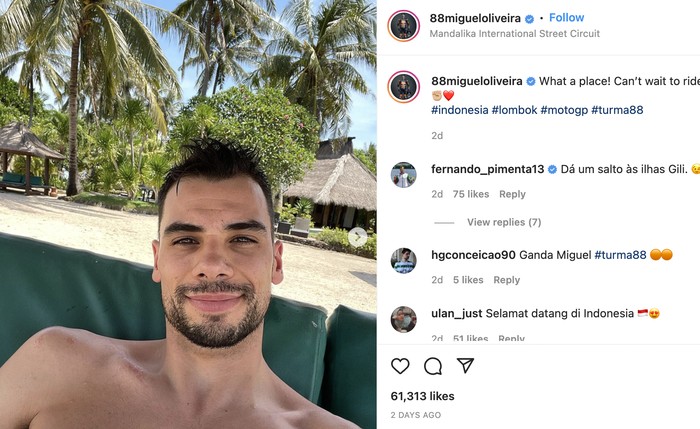 15. Miguel Oliviera: Senyum Miguel Oliviera ini telah disukai oleh lebih dari 61 ribu netizen.Β Foto: Instagram