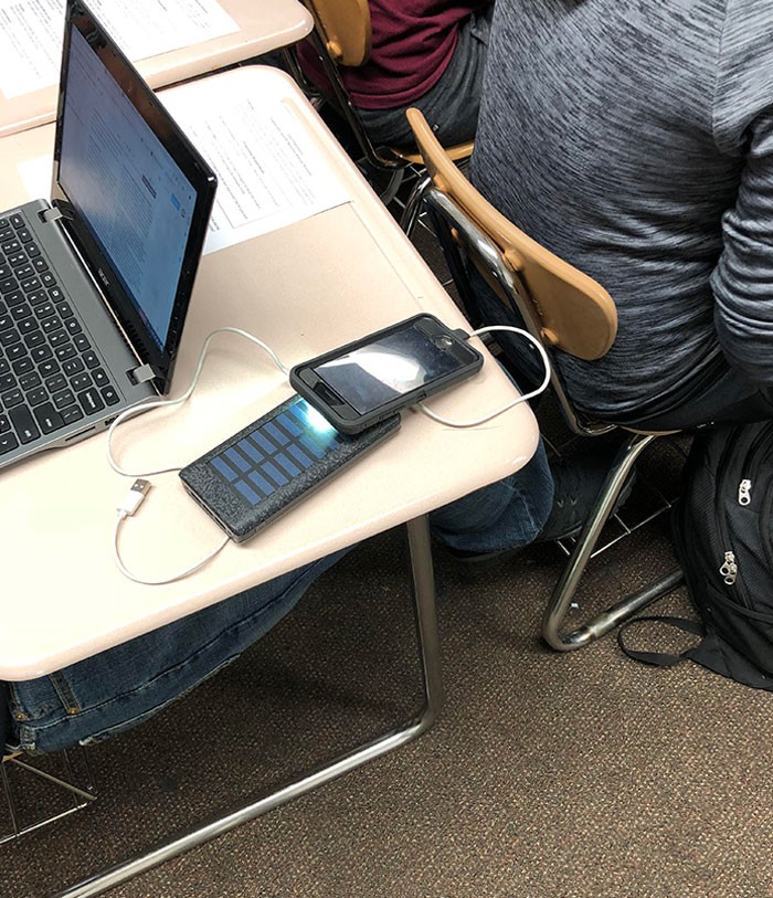 Senter yang ada di handphone digunakan untuk mengisi daya portable solar battery, tujuannya agar ia bisa charge hp-nya. Hmm. Foto: IKnowICantSpel via Bored Panda