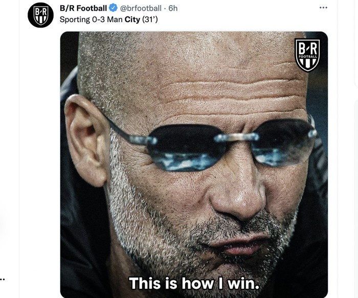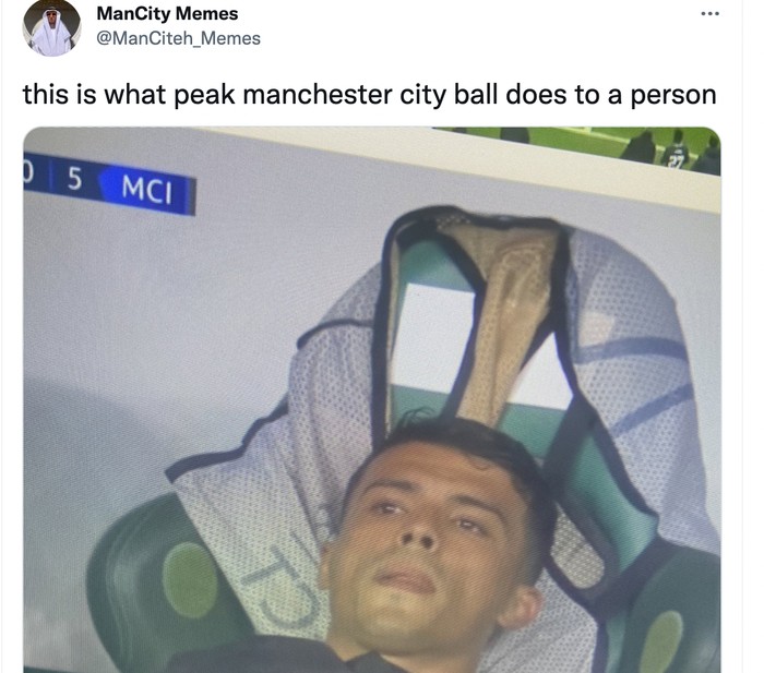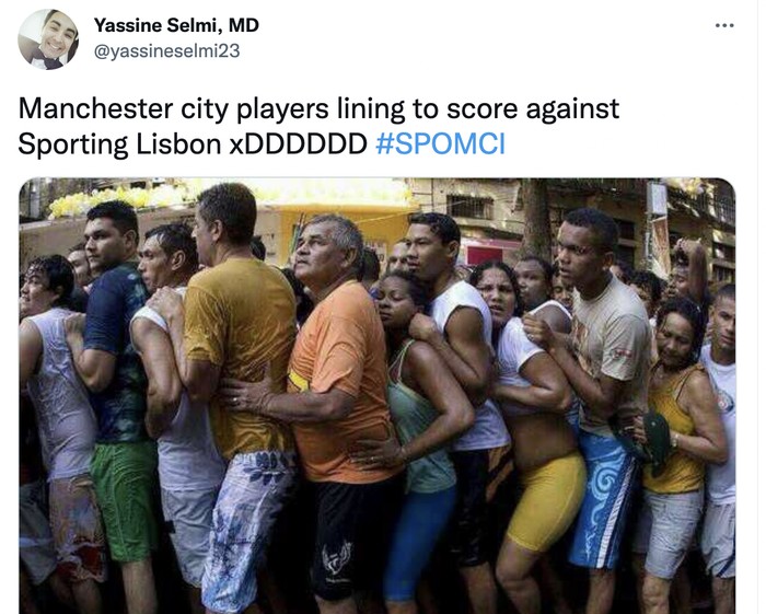 Meme pemain Manchester City antre untuk ikut menjebol gawang Sporting Lisbon. Foto: Twitter