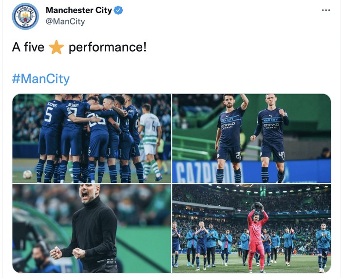 Akun Twitter Manchester City merayakan kemenangan besar atas Sporting Lisbon. Foto: Twitter