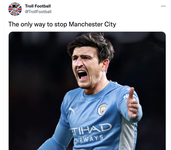 Mungkin City baru bisa dikalahkan jika beknya adalah Harry Maguire. Foto: Twitter