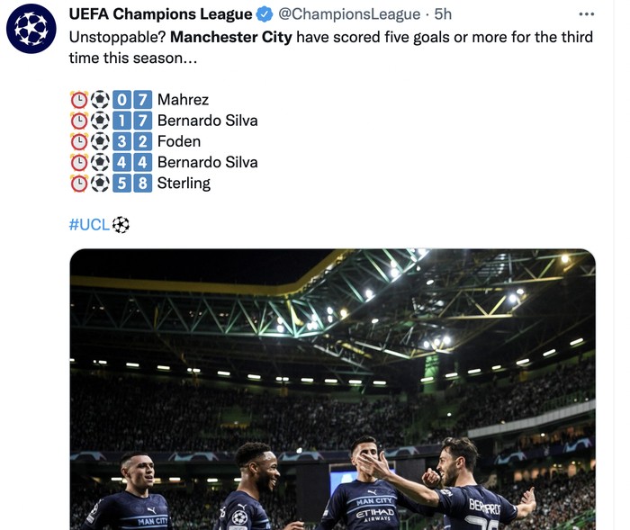 Akun resmi UEFA Champions League menyebut bahwa City tak terhentikan sejauh ini. Foto: Twitter