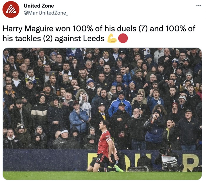 Penampilan Harry Maguire semalam dianggap cukup bagus setelah sering mengecewakan. Dia berhasil menjaga pertahanan MU dari serangan Leeds walau kebobolan juga dua gol. Foto: Twitter