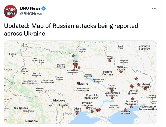 Sementara itu, media sosial juga menjadi media untuk mengabarkan kondisi terkini perang Rusia dan Ukraina. Ini adalah peta di mana serangan Rusia dilaporkan terjadi di wilayah Ukraina. Foto: Twitter