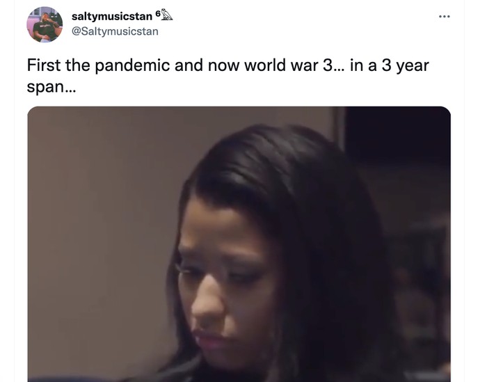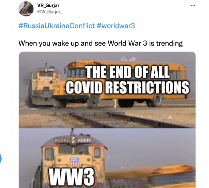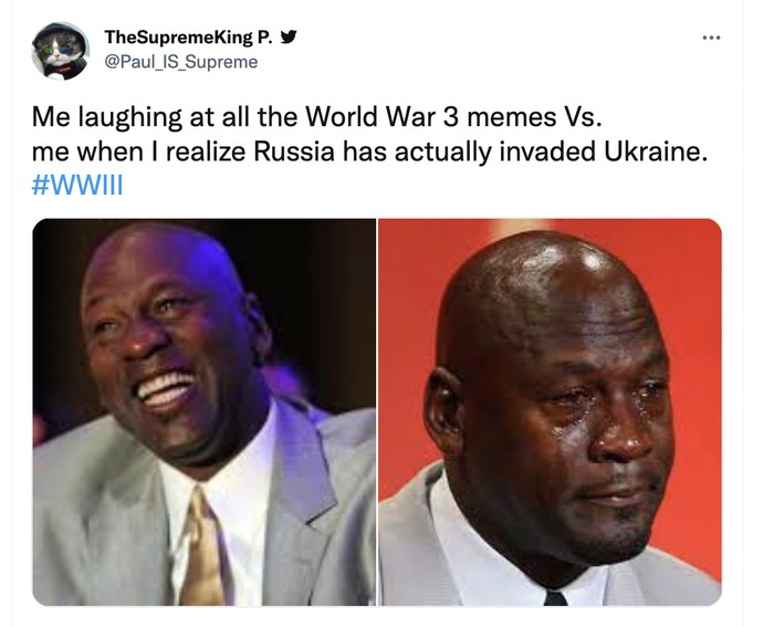 Netizen ini awalnya tertawa melihat meme Perang Dunia 3 tapi jadi cemas kemungkinannya besar setelah Rusia menginvasi Ukraina. Foto: Twitter
