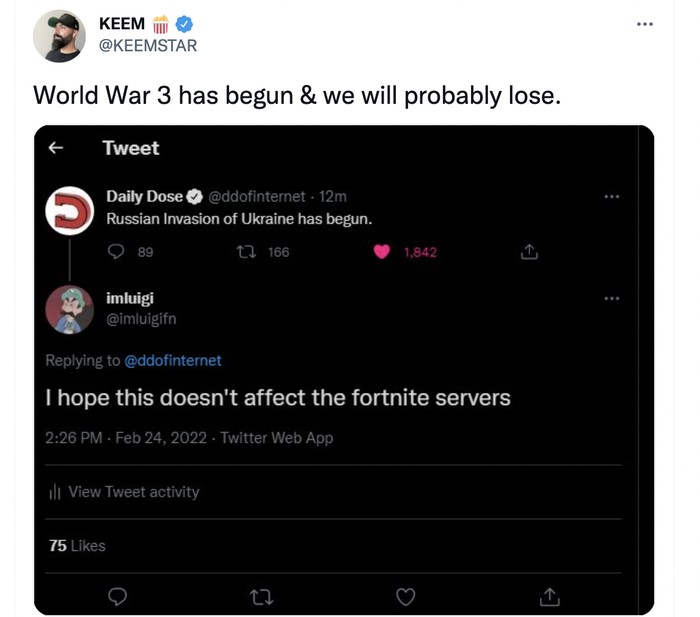 Jika Perang Dunia 3 terjadi, semuanya akan menderita tapi netizen ini malah hanya berharap server game Fortnite tidak terdampak sehingga tetap bisa main game. Foto: Twitter