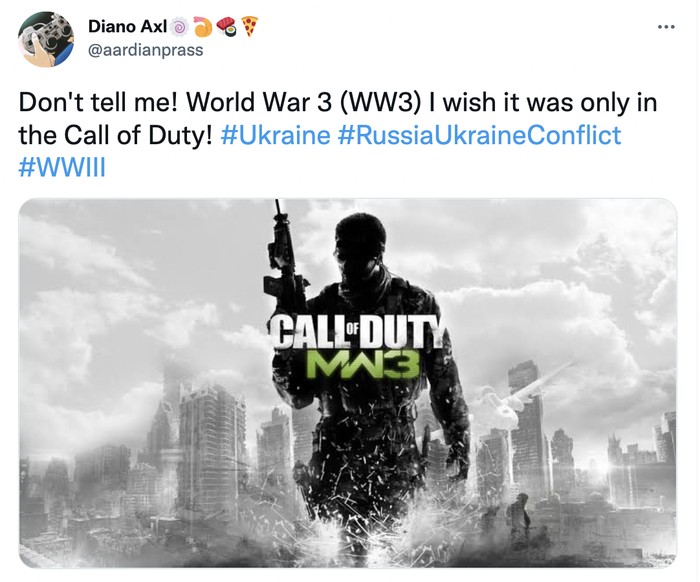 Netizen ini berharap agar Perang Dunia hanya ada di dunia game Call of Duty saja. Foto: Twitter