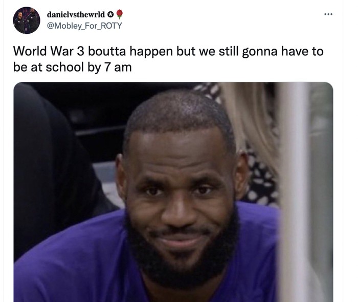 Perang Dunia 3 pun jadi topik yang mulai banyak dibicarakan netizen setelah Rusia menyerang Ukraina, baik dengan nada bercanda atau serius. Netizen ini bercanda bahwa Perang Dunia 3 akan dimulai tapi dia masih saja tetap harus masuk pagi ke sekolah. Foto: Twitter