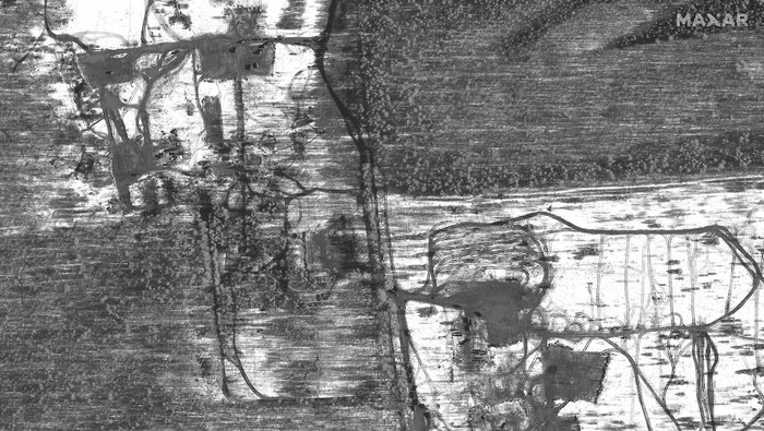 Tanggal 22 Februari 2022, ada kegiatan pembersihan lahan untuk persiapan pasukan dan peralatan di Pochep, Russia. (Maxar Technologies)