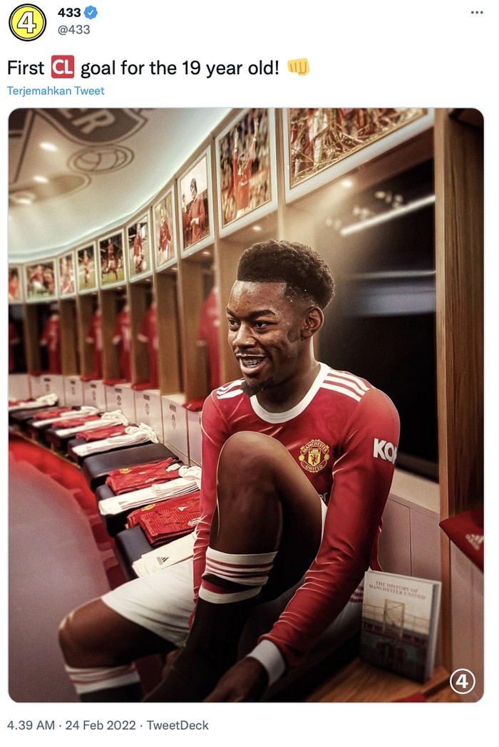 Athony Elanga datang sebagai supersub dan mengakhiri lagi dengan skor imbang 1-1 di lega pertama. Foto: Twitter