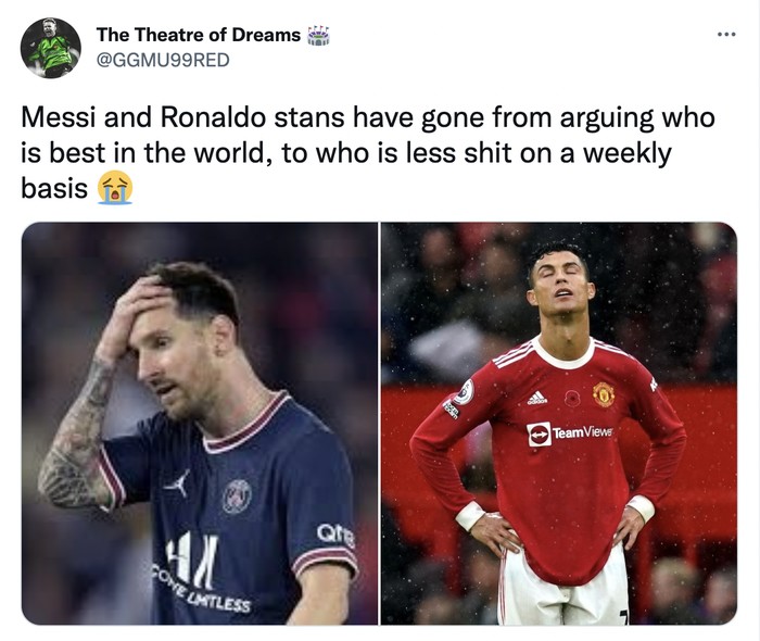 Dari dua pemain terbaik dunia, Lionel Messi dan Cristiano Ronaldo belakangan ini tampaknya hanya mencoba tidak bermain buruk saja sudah baik. Foto: Twitter