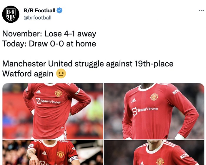 MU ternyata sangat kesulitan melawan Watford baik kandang maupun tandang. "MU bukan lagi klub besar tanpa alasan," sindir akun ini. Foto: Twitter