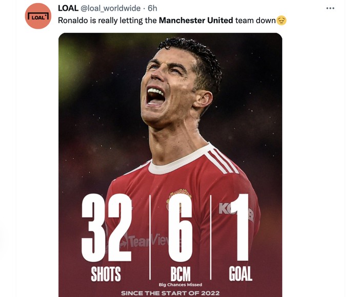 Ronaldo dinilai terlalu banyak membuang peluang dan membuat rekan setimnya kecewa. Tahun 2022 ini, dia tidak produktif mencetak gol, termasuk semalam kala MU melawan Watford. Foto: Twitter