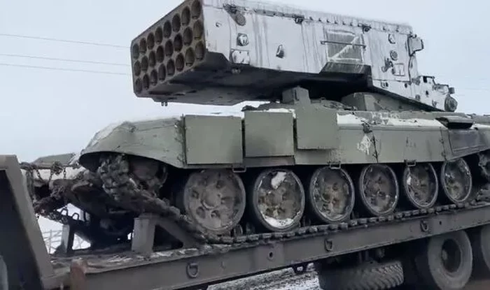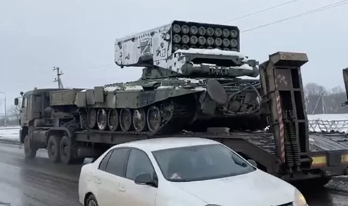Kendaraan yang mengangkut tank Rusia dengan di atasnya peluncur bom vakum saat dilihat di perbatasan Ukraina. Bom vakum itu nama lainnya adalah thermobaric yang punya kemampuan mengerikan Foto: Daily Star