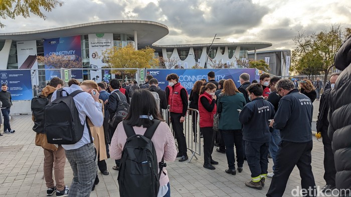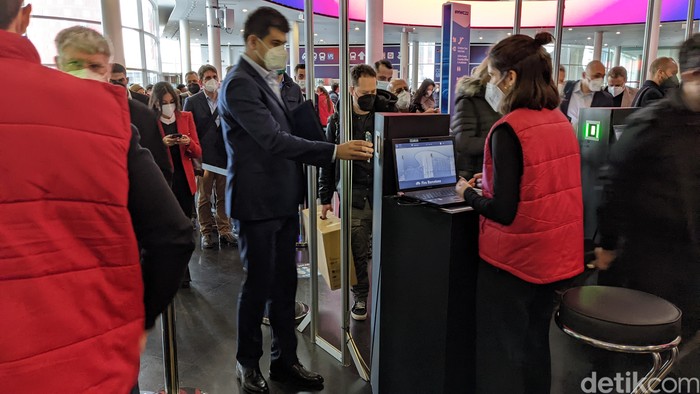 Suasana sebelum memasuki venue, pengunjung harus memperlihatkan badge digitalnya yang ada di aplikasi resmi MWC 2022 kepada petugas. Foto: Virgina Maulita Putri/detikINET