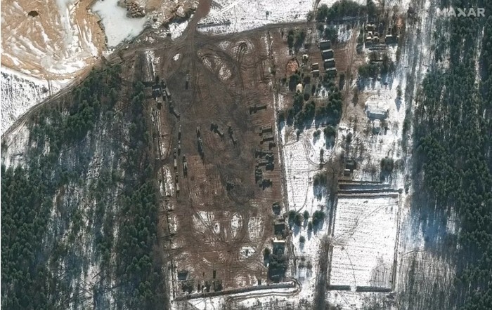 Gambar ini, diambil pada 4 Februari 2022 oleh satelit Maxar Worldview 3, menunjukkan Lapangan Terbang VD Bolshoy Bokov di dekat Mazyr, Belarusia, sebelum pasukan Rusia pindah ke daerah tersebut. Foto: Maxar Technologies