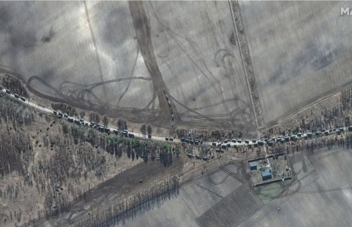 Konvoi militer Rusia sepanjang 40 mil terlihat dari luar angkasa mendekati ibu kota Ukraina yang terkepung, Kyiv, pada 28 Februari 2022. Foto: Maxar Technologies