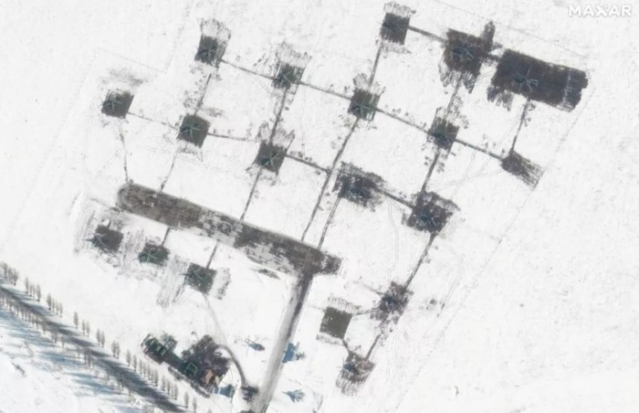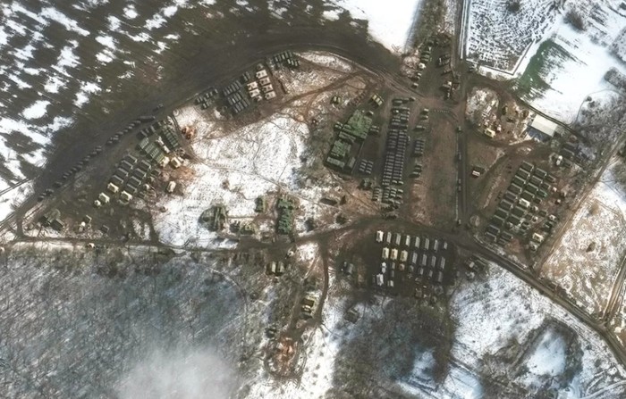 Gambar ini diambil pada 21 Februari 2022, oleh satelit Maxar WorldView 3, menunjukkan penyebaran baru dukungan logistik dan pasukan di Krasnyi Oktyabr di Rusia, barat daya Belgorod. Foto: Maxar Technologies