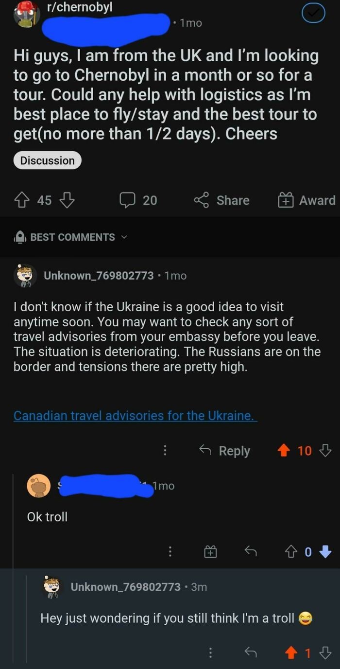 Orang ini mau ke Chernobyl lalu diingatkan karena ada ketegangan antara Rusia dan Ukraina. "Hi Guys, aku dari Inggris dan mau pergi ke Chernobyl sebulan lagi untuk tur. Ada yang bisa bantu logistik?" Eh malah menyebut orang yang mengingatkan sebagai 'troll'. Padahal peringatan itu benar, perang telah berkecamuk. Foto: Unknown_769802773 via Bored Panda