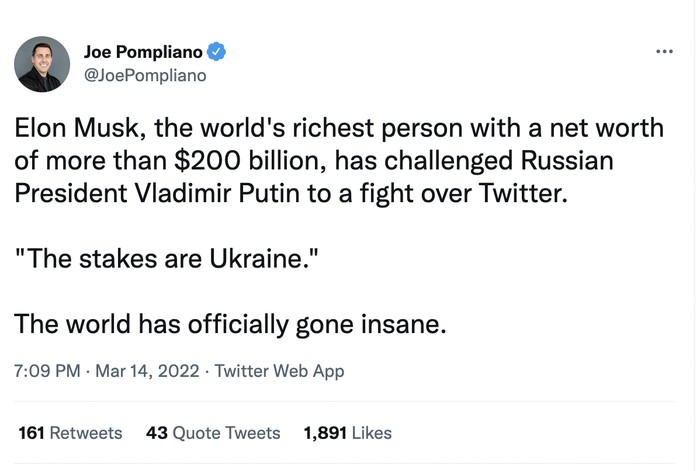 "Elon Musk, orang terkaya dunia dengan harta lebih dari USD 200 miliar, menantang presiden Rusia untuk berkelahi. Taruhannya Ukraina. Dunia ini sudah resmi jadi gila," sebut netizen ini. Foto: Twitter