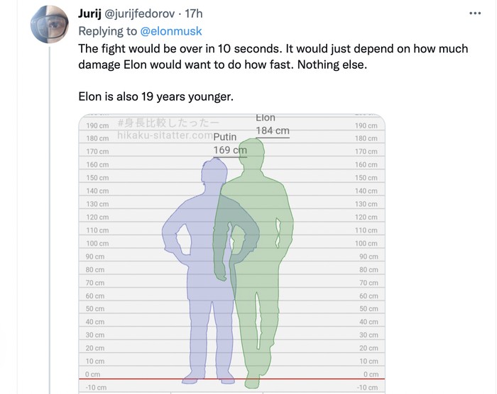 Menurut netizen ini, adu jotos Musk dan Putin akan selesai dalam 10 menit dengan kemenangan Musk. Selain lebih tinggi, Musk juga 10 tahun lebih muda dibanding Putin. Foto: Twitter