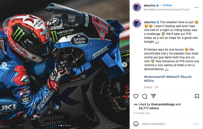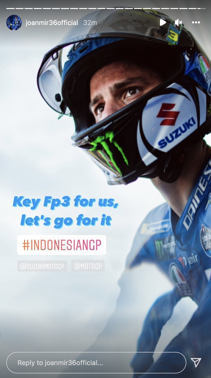 Joan Mir penuh harap dan semangat dalam menjalani sesi latihan bebas ini. Foto: Instagram
