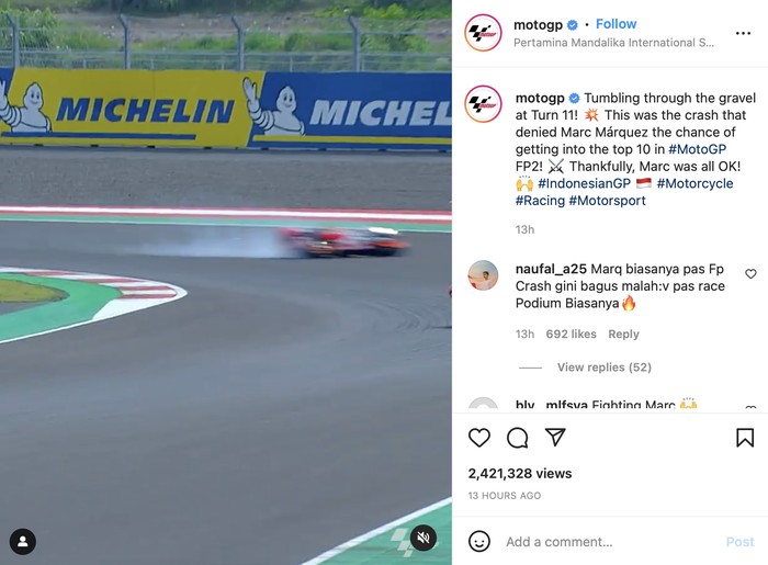 Bahkan, Marc Marquez juga turut jadi 'korban' dan belum menjinakkan sirkuit anyar ini. Foto: Instagram