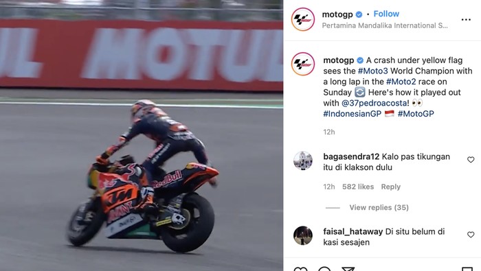 Momen saat pembalap Moto2 Pedro Costa terjatuh saat sesi latihan bebas di Sirkuit Mandalika. Foto: Instagram