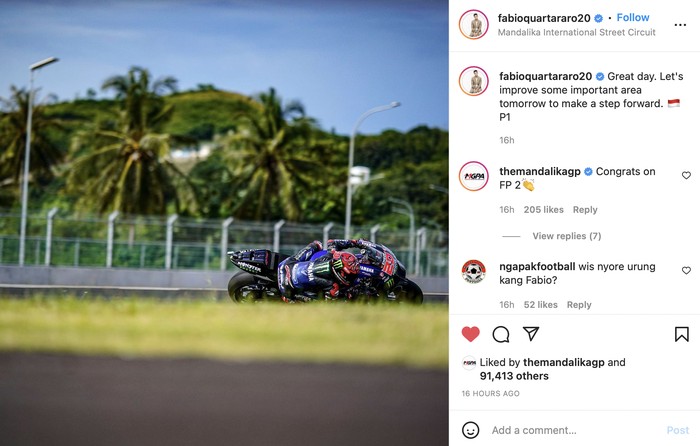 Fabio Quartararo jadi yang tercepat pada sesi latihan bebas yang kedua. Akankah dia naik podium saat series Mandalika ini? Foto: Instagram