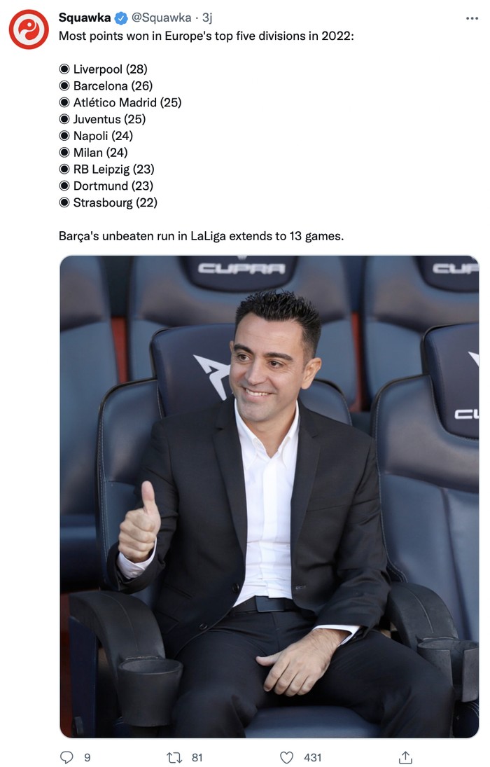Statistik Barcelona di tangan Xavi sedang ganas-ganasnya. Foto: Twitter