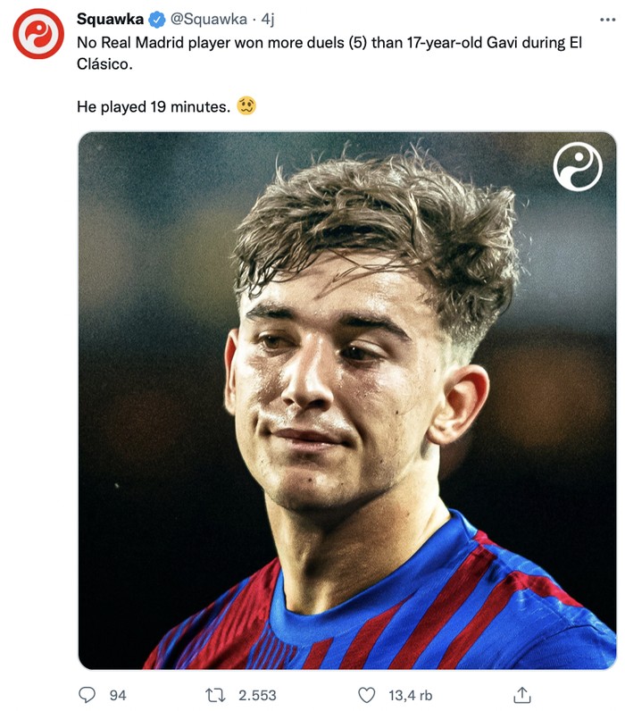Gavi yang bermain 19 menit malah lebih impresif dibandingkan seluruh pemain El Real yang main tadi malam. Foto: Twitter