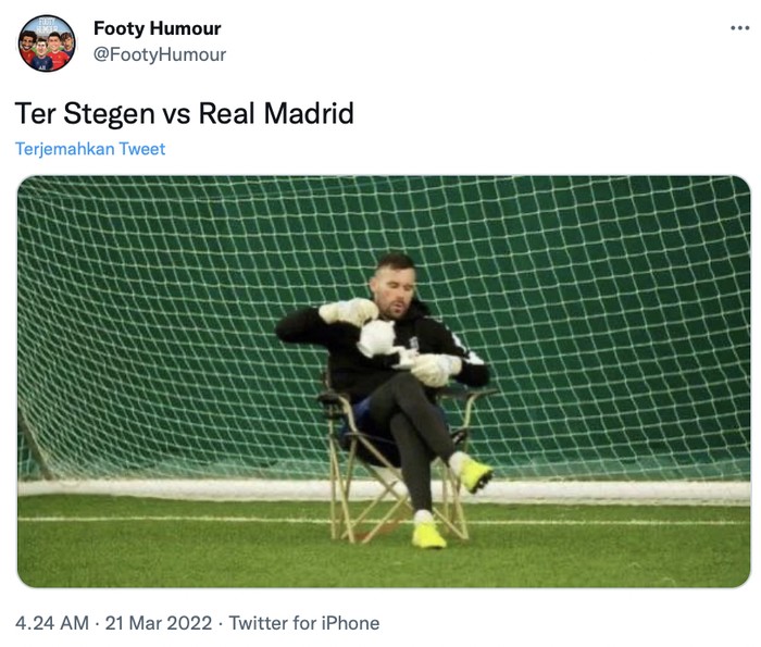 Kiper Barcelona Ter Stegen yang digambarkan di partai El Clasico tadi malam begitu santai. Foto: Twitter