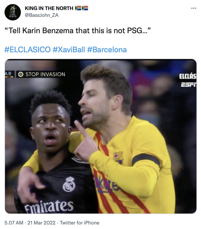 Meme Piques memberitahu, ini Barcelona bukan PSG yang baru disingkirkan Real Madrid. Foto: Twitter