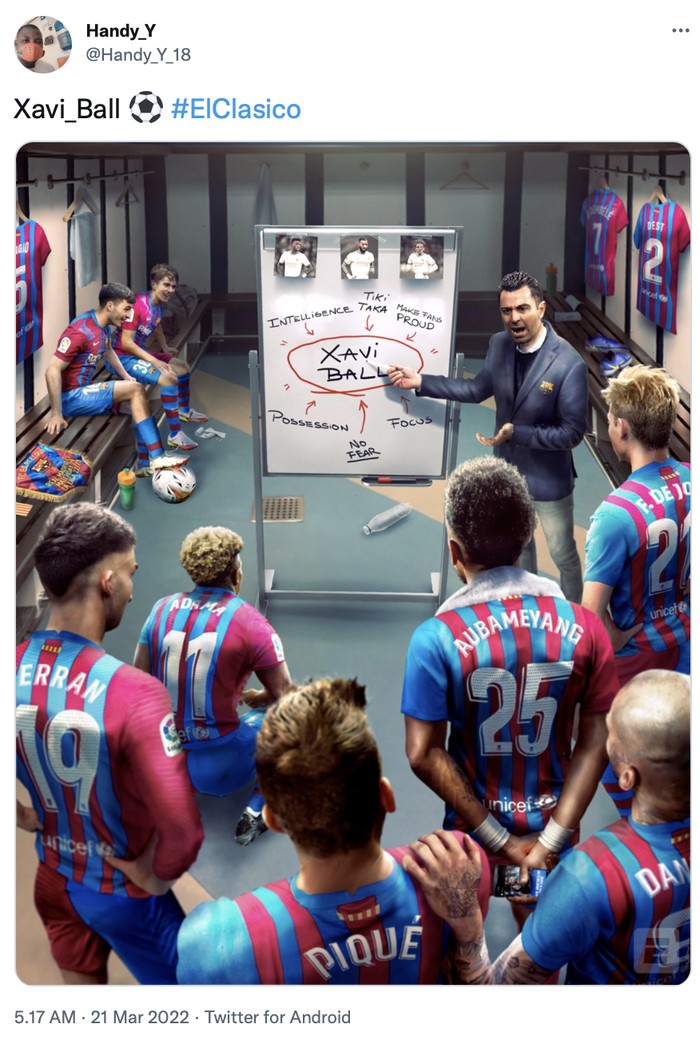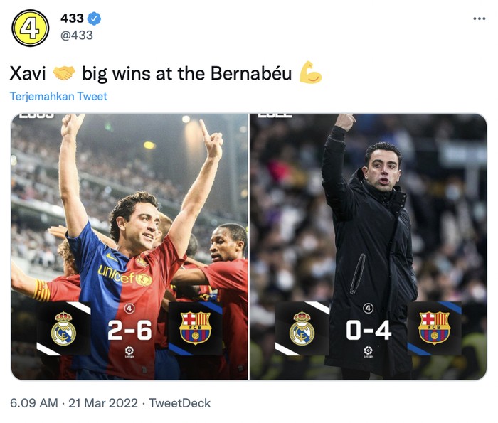 Xavi tampaknya punya rumus tersendiri untuk menjungkalkan Real Madrid secara sempurna, baik sebagai pemain maupun pelatih. Foto: Twitter