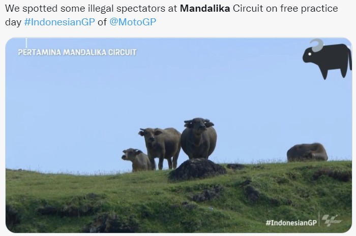 Penonton liar di MotoGP Mandalika, maksudnya adalah kerbau-kerbau di perbukitan. Foto: Twitter