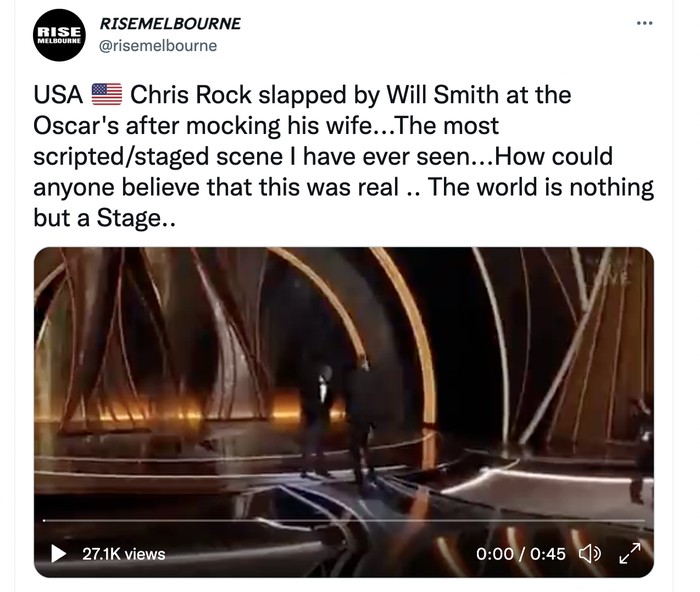 "Jika kamu ditampar oleh seseorang seperti Will Smith, kamu akan berada di lantai 30 detik lamanya. Semua ini cuma sandiwara dalam usaha membalikkan penurunan rating. Lagipula, mereka semua aktor," cetus akun ini. Foto: Twitter
