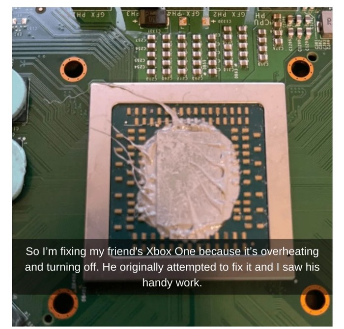Pasta termal atau pendingin prosesor digunakan untuk mengisi celah udara, memungkinkan transfer panas yang lebih efisien pada barang-barang listrik. Namun jika terlalu banyak bisa merusak perangkat tersebut. Seperti ini di mana teknisi harus pintar untuk memperbaiki konsol Xbox One karena kebanyakan pasta termal. Foto: Drivepedia