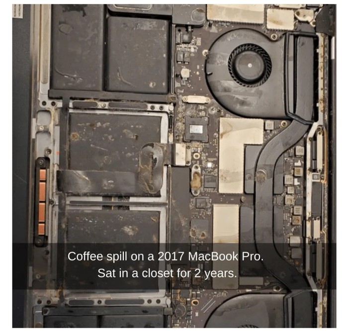 Begini jadinya jika MacBook 2017 ketumpahan kopi panas sudah lama, bukannya langsung diperbaiki tapi dibiarkan di lemari selama dua tahun. Foto: Drivepedia