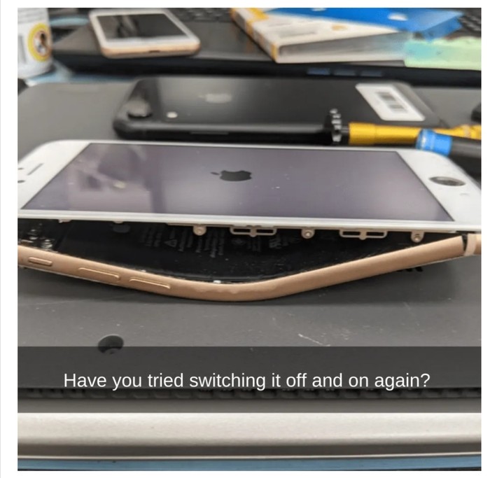 Teknisi ini dibuat bingung saat harus memperbaiki bagian belakang iPhone yang bengkok namun bagian layarnya tetap utuh sepenuhnya.Β Foto: Drivepedia